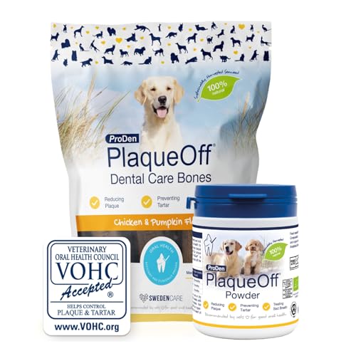 ProDen PlaqueOff 100% Natural Tartar & Bad Breath Remover for Dogs 60g Dental Powder with 13 Veggie Bones - Bundle for Healthy Teeth & Fresh Breath