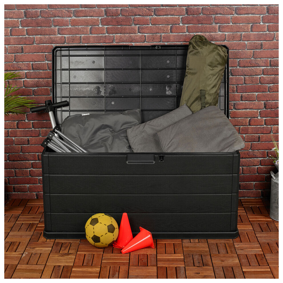 Gr8 Garden 320 Litre Black Plastic Storage Box Lid Patio Shed Utility Cushion Chest Wooden Fence Panel Effect Large Truck Indoor Outdoor Furniture