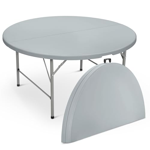60" Round Folding Table, 5 Feet Bi-Folding Plastic Commercial Dining Card Table w/Carrying Handle for Outdoor Wedding Party Event Picnic, Gray