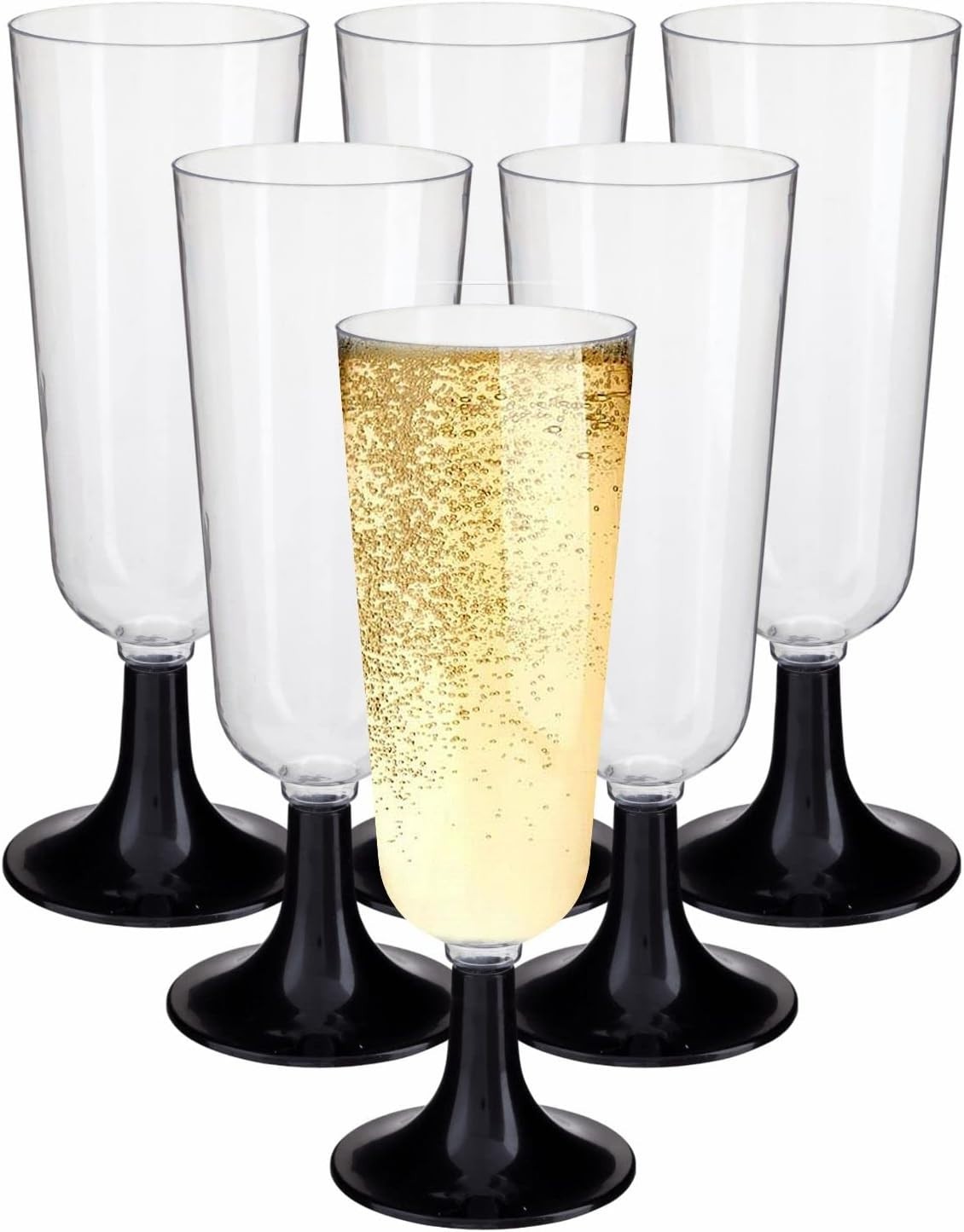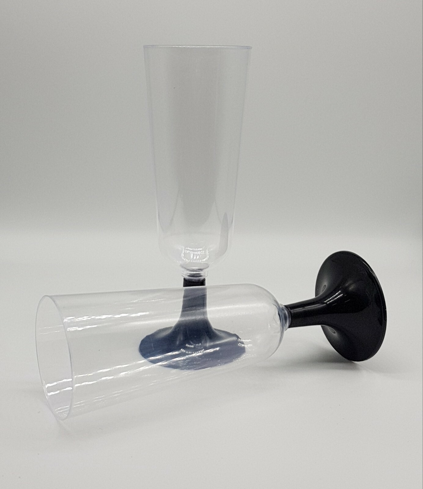 100 x Clear Plastic Party CHAMPAGNE Glasses Flutes with a Black Base - (BC)