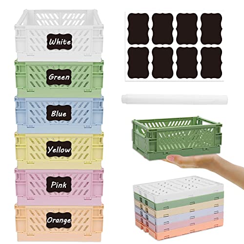 Ruucy 6 Pcs Collapsible Storage Crates, Mini Plastic Crates 15x9.8x5.7cm, Stackable Storage Baskets with White Marker + Stickers, Small Pastel Crate Desktop Storage Box for Office Kitchen Bathroom