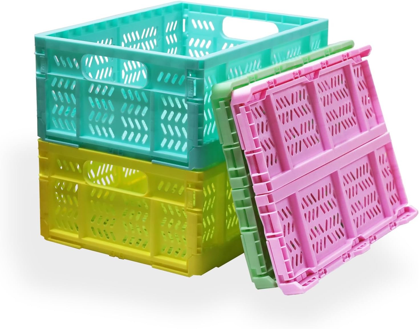 4 Pack Plastic Storage Crates Foldable Shelf Storage Basket Bins for Food Fruit Vegetables Snacks Bottles Toys Toiletries, Home Kitchen Office Storage