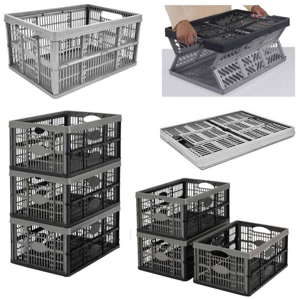 New Flat Plastic Storage Crates Boxes Stackable 32 litre Black & Grey 5 x Fold