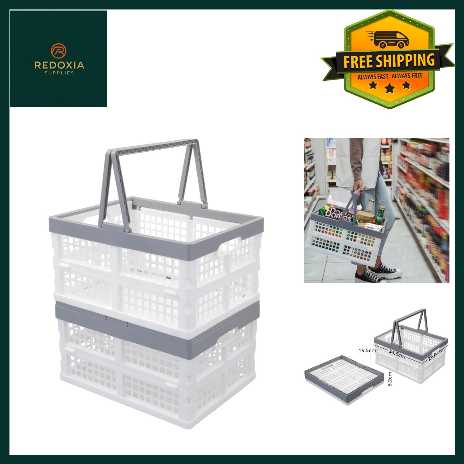 Collapsible Plastic Storage Crates with Handle â Stackable, Heavy Duty, Foldable Baskets for Home/Office/Classroom â Compatible with Standard