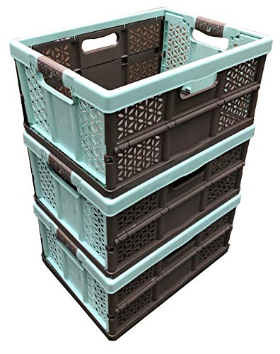 keeeper 3 x 32 Litre Extra Strong Folding Plastic Stacking Storage Crates Box - 30KG LOAD CAPACITY PER BOX - SOFT HANDLES, Blue/Brown