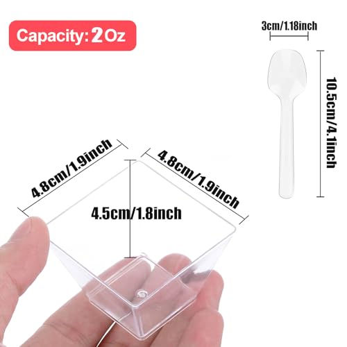 PALUDO 150ml Mini Dessert Cups with Spoons, 50 Pack Reusable Clear Square Plastic Dessert Cups, Cheesecake Pots, Multi-use Serving Dessert Bowls for Mousse Puddings Desserts Party Supplies