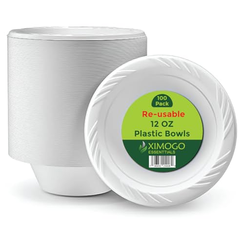 XIMOGO Pack of 100 White Plastic Bowls – 12 OZ, Washable & Reusable –Microwaveable- Perfect for Parties, Dessert, and Picnic Tableware.Reliable,Stackable,Reuseable and Light Plastic Bowls.