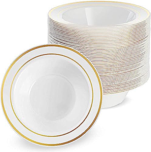 MATANA 25 Premium White Plastic Bowls with Gold Rim, 360ml - Elegant, Sturdy & Reusable - Soup & Dessert Bowls for Weddings, Birthdays, BBQ, Buffets, Catering, Parties