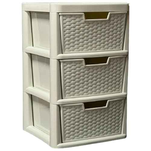 ALEEZ - Large Plastic Drawer Storage Unit - Rattan Effect 3 Drawer Cabinet - Multipurpose Storage Organiser - Office, Tabletop Desktop Drawer - Bedroom Chest Drawer Unit - (Cream, 3 Drawer)