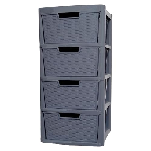 ALEEZ - Large Plastic Drawer Storage Unit - Rattan Effect 4 Drawer Cabinet - Multipurpose Storage Organiser - Office, Tabletop Desktop Drawer - Bedroom Chest Drawer Unit - (Grey, 4 Drawer)