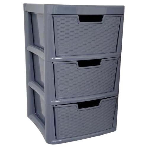 ALEEZ - Large Plastic Drawer Storage Unit - Rattan Effect 3 Drawer Cabinet - Multipurpose Storage Organiser - Office, Tabletop Desktop Drawer - Bedroom Chest Drawer Unit - (Grey, 3 Drawer)