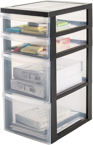 Iris Ohyama, Compact Plastic Stacking Storage Drawer Unit, Black, Easy-Pull Drawers, 4 Pack, 7 L, File Organiser, For Office, School, Stationary, BPA Free, Chest, Tower, BPA free, MSD-1