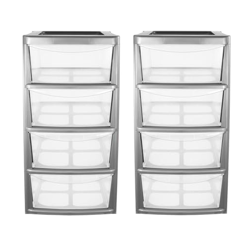 simpa Mini Plastic 4 Drawer Tower Storage Unit - Silver Gloss Finish, Set of 2 Units - 40cm (H) x 19cm (W) x 25.5cm (D)