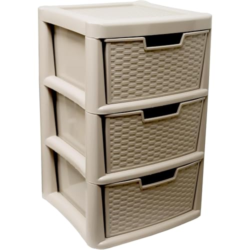 ALEEZ - Large Plastic Drawer Storage Unit - Rattan Effect 3 Drawer Cabinet - Multipurpose Storage Organiser - Office, Tabletop Desktop Drawer - Bedroom Chest Drawer Unit - (Mushroom, 3 Drawer)