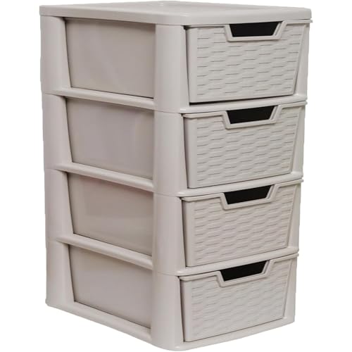 ALEEZ - Large Plastic Drawer Storage Unit - Rattan Effect 4 Drawer Cabinet - Multipurpose Storage Organiser - Office, Tabletop Desktop Drawer - Bedroom Chest Drawer Unit - (Mushroom, 4 Drawer)