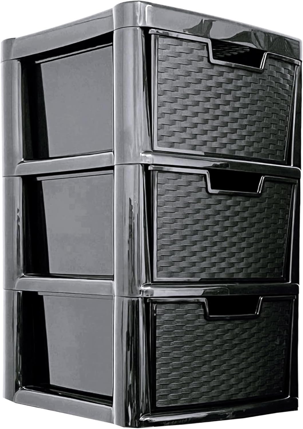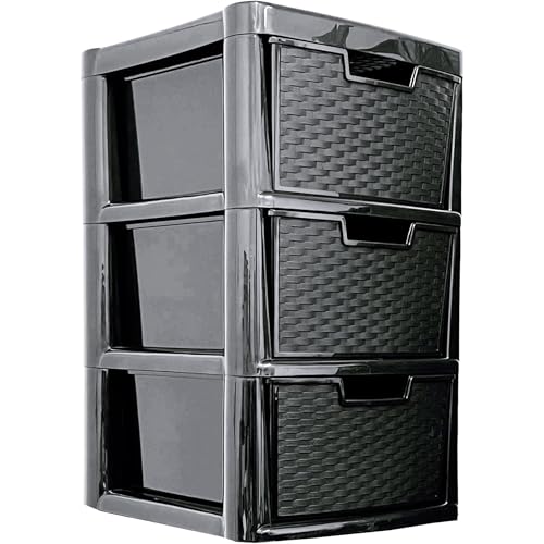 ALEEZ - Large Plastic Drawer Storage Unit - Rattan Effect 3 Drawer Cabinet - Multipurpose Storage Organiser - Office, Tabletop Desktop Drawer - Bedroom Chest Drawer Unit - (Black, 3 Drawer)