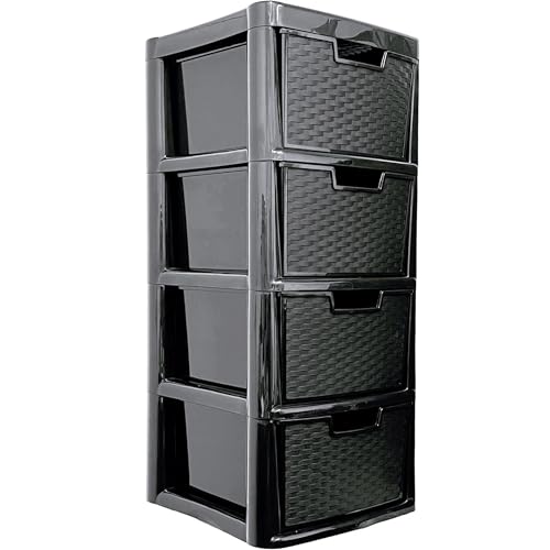 ALEEZ - Large Plastic Drawer Storage Unit - Rattan Effect 4 Drawer Cabinet - Multipurpose Storage Organiser - Office, Tabletop Desktop Drawer - Bedroom Chest Drawer Unit - (Black, 4 Drawer)