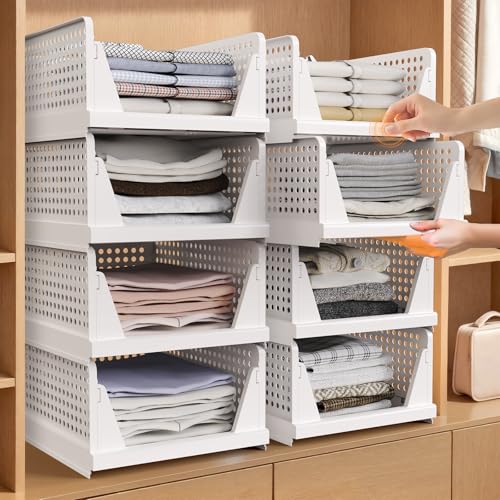 Tuocal 8 Pack Wardrobe Storage Organisers, Folding Closet Organisers Plastic Storage Drawer, Stackable Storage Boxes Space-Saving Clothes Storage Organiser Basket for Bedroom Kitchen Bathroom White