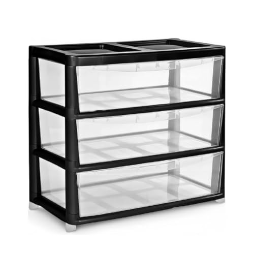 Khanary Jumbo Chest Drawer Plastic Storage Unit – Multi-Purpose Modular Drawer Tower Home,Office,Bedroom, Nursery & School - Dorm Room Storage Solution (Black/Clear, 3 Drawers Jumbo)