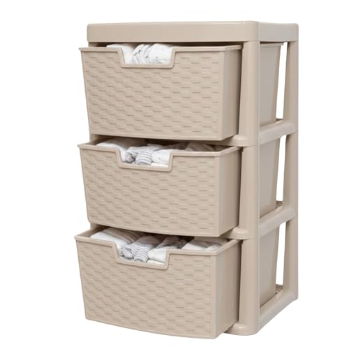 ALEEZ - Large Plastic Drawer Storage Unit - Rattan Effect 3 Drawer Cabinet - Multipurpose Storage Organiser - Office, Tabletop Desktop Drawer - Bedroom Chest Drawer Unit - (Mushroom, 3 Drawer)