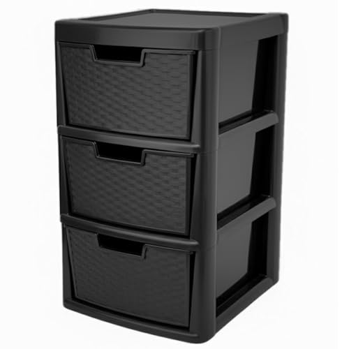ALEEZ - Large Plastic Drawer Storage Unit - Rattan Effect 3 Drawer Cabinet - Multipurpose Storage Organiser - Office, Tabletop Desktop Drawer - Bedroom Chest Drawer Unit - (Black, 3 Drawer)