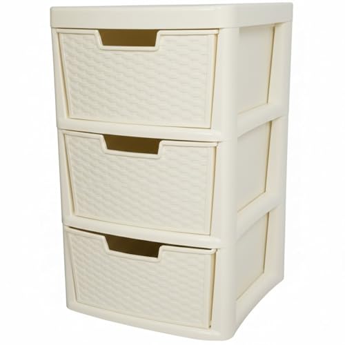 ALEEZ - Large Plastic Drawer Storage Unit - Rattan Effect 3 Drawer Cabinet - Multipurpose Storage Organiser - Office, Tabletop Desktop Drawer - Bedroom Chest Drawer Unit - (Cream, 3 Drawer)