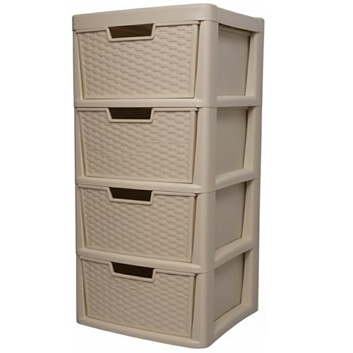ALEEZ - Large Plastic Drawer Storage Unit - Rattan Effect 4 Drawer Cabinet - Multipurpose Storage Organiser - Office, Tabletop Desktop Drawer - Bedroom Chest Drawer Unit - (Mushroom, 4 Drawer)