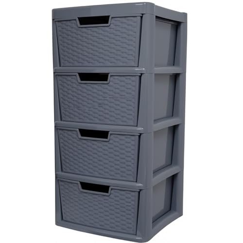 ALEEZ - Large Plastic Drawer Storage Unit - Rattan Effect 4 Drawer Cabinet - Multipurpose Storage Organiser - Office, Tabletop Desktop Drawer - Bedroom Chest Drawer Unit - (Grey, 4 Drawer)