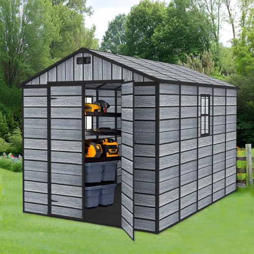 BIRCHTREE 8X10FT Plastic Garden Shed with Floor Apex Roof Wood Grain Effect Fade Free All Weather Resistant Lockable Door Outdoor Storage Box Air Vent&Window Garden Tool Shed Low Maintenance Grey