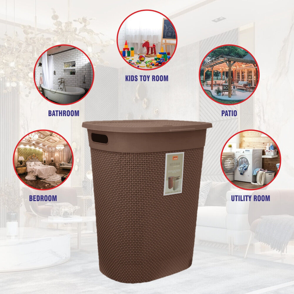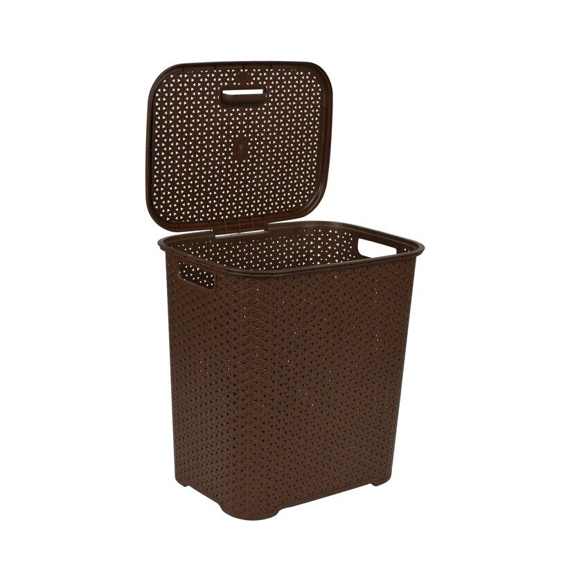 BH | 65L - Plastic Laundry Basket | Brown | Large | Knitted/Rattan Style | With Lid | Durable, Lightweight | Clothes Washing Bin Basket Hamper for Bathroom Bedroom (Pack of 1) - By BEST HOUSE