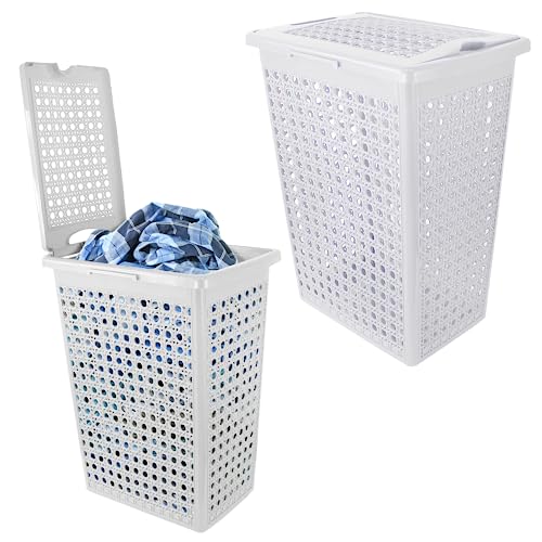 60L Laundry Basket with Lid - Large Plastic Washing Basket with Handles - Heavy-Duty Rattan Laundry Bin Hamper Clothes Storage Organiser for Bedroom & Bathroom - White, 60 Litre