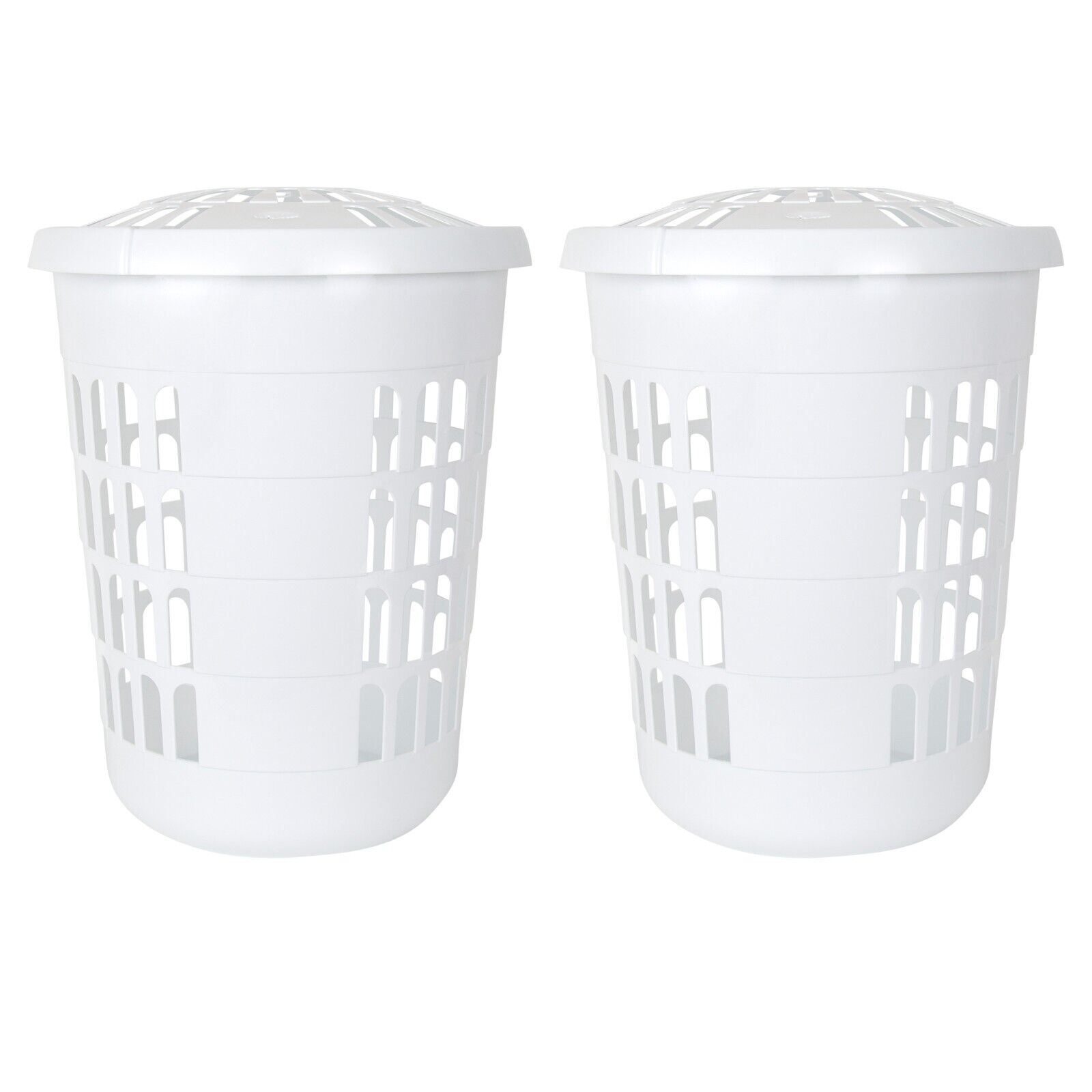 2 x 60L Round Plastic Laundry Basket Bin Storage Hamper With Lid - Ice White