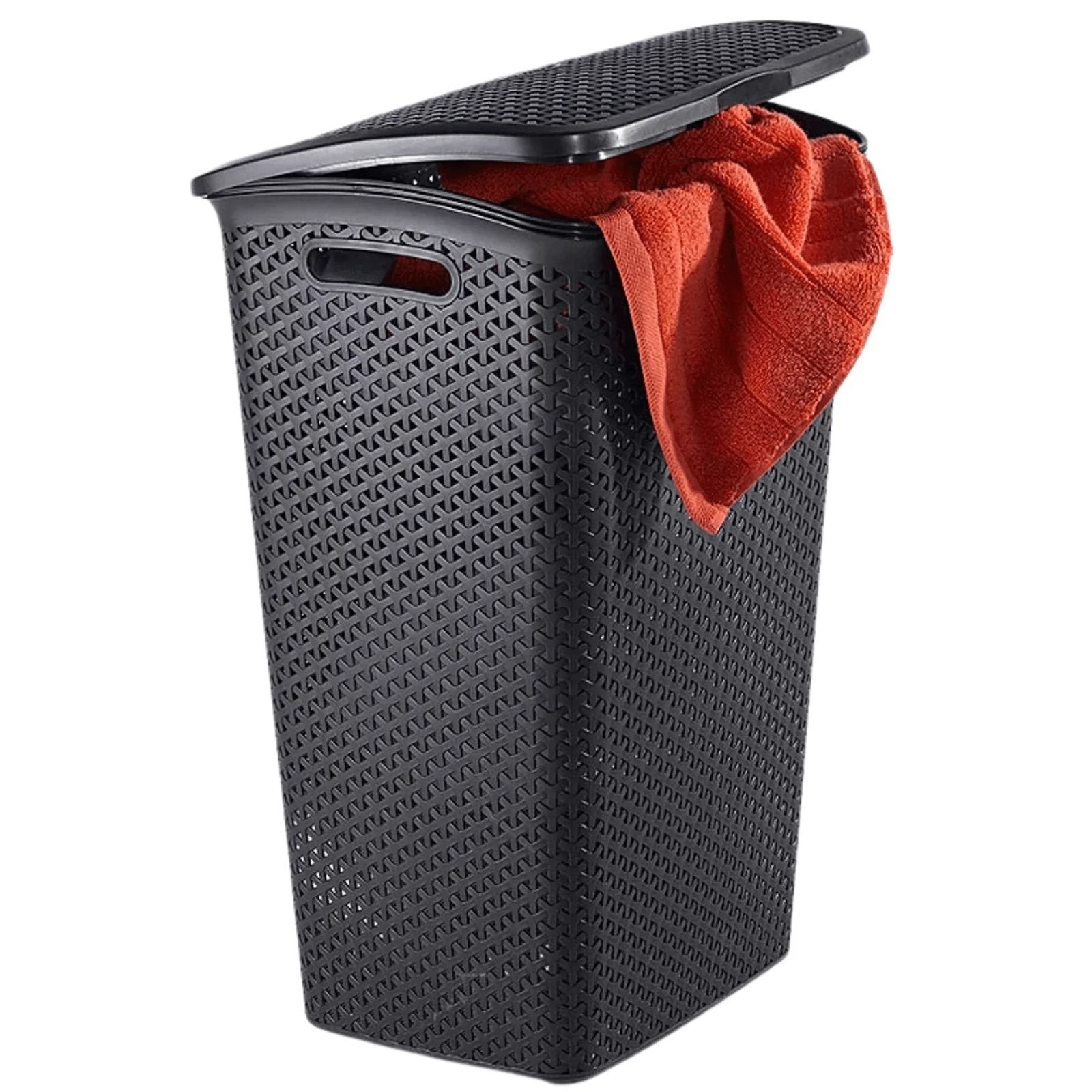 48L Grey Plastic Slimline Bathroom Washing Basket Laundry Linen Hamper Storage Clothes Bin Hinged Lid Rattan Style