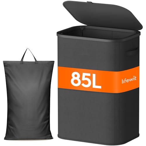 Lifewit 85L Plastic Laundry Hamper with Lid, Foldable Laundry Basket with Removable Bag and Lid, Large Tall Dirty Clothes Hamper for Laundry Room, Bathroom, Bedroom, Dorm, Black