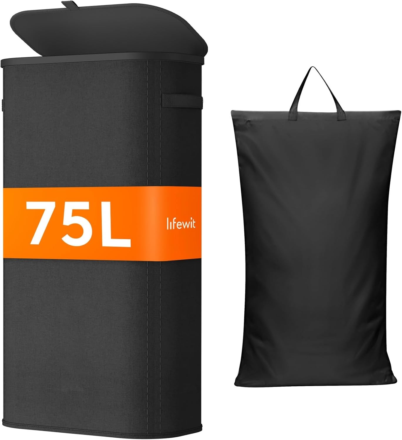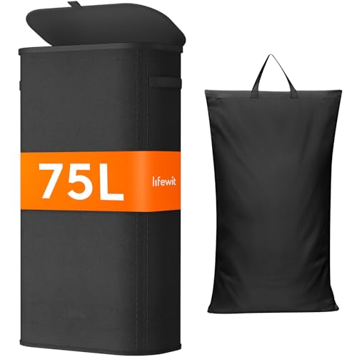 Lifewit 75L Slim Laundry Basket with Lid, Narrow Laundry Hamper with Plastic Handles and Removable Bag, Thin Dirty Clothes Hampers for Laundry for Laundry Room, Bedroom, Bathroom, Dorm, Black