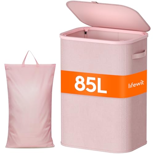 Lifewit 85L Plastic Laundry Hamper with Lid, Foldable Laundry Basket with Removable Bag and Lid, Large Tall Dirty Clothes Hamper for Laundry Room, Bathroom, Bedroom, Dorm, Pink