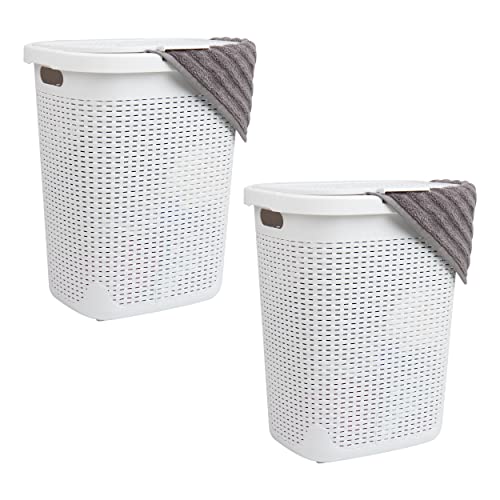 Mind Reader 50L Slim Laundry Hamper, Set of 2, Clothes Basket, Lid, Wicker Design, Plastic, 17.65"L x 13.75"W x 21"H, White