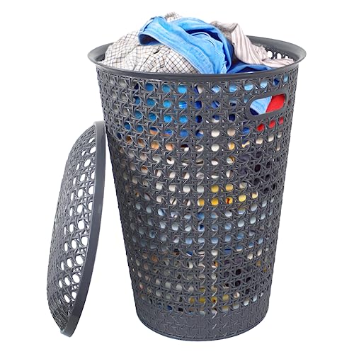 48L Plastic Laundry Basket with Lid - Large Round Washing Hamper with Handles for Clothes & Linen - Rattan Storage Basket for Bathroom, Bedroom & Utility Room - Grey, White or Taupe, 48 Litres (Grey)