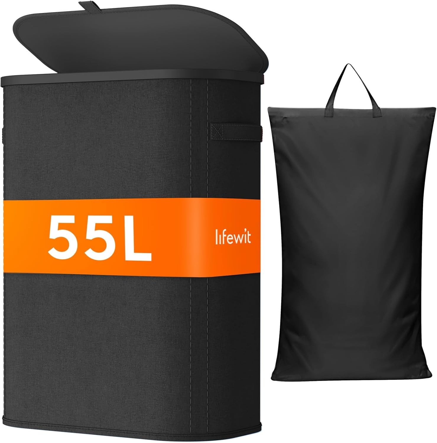 Lifewit 55L Slim Laundry Basket with Lid, Narrow Laundry Hamper with Plastic Handles and Removable Bag, Thin Dirty Clothes Hampers for Laundry for Laundry Room, Bedroom, Bathroom, Dorm, Black