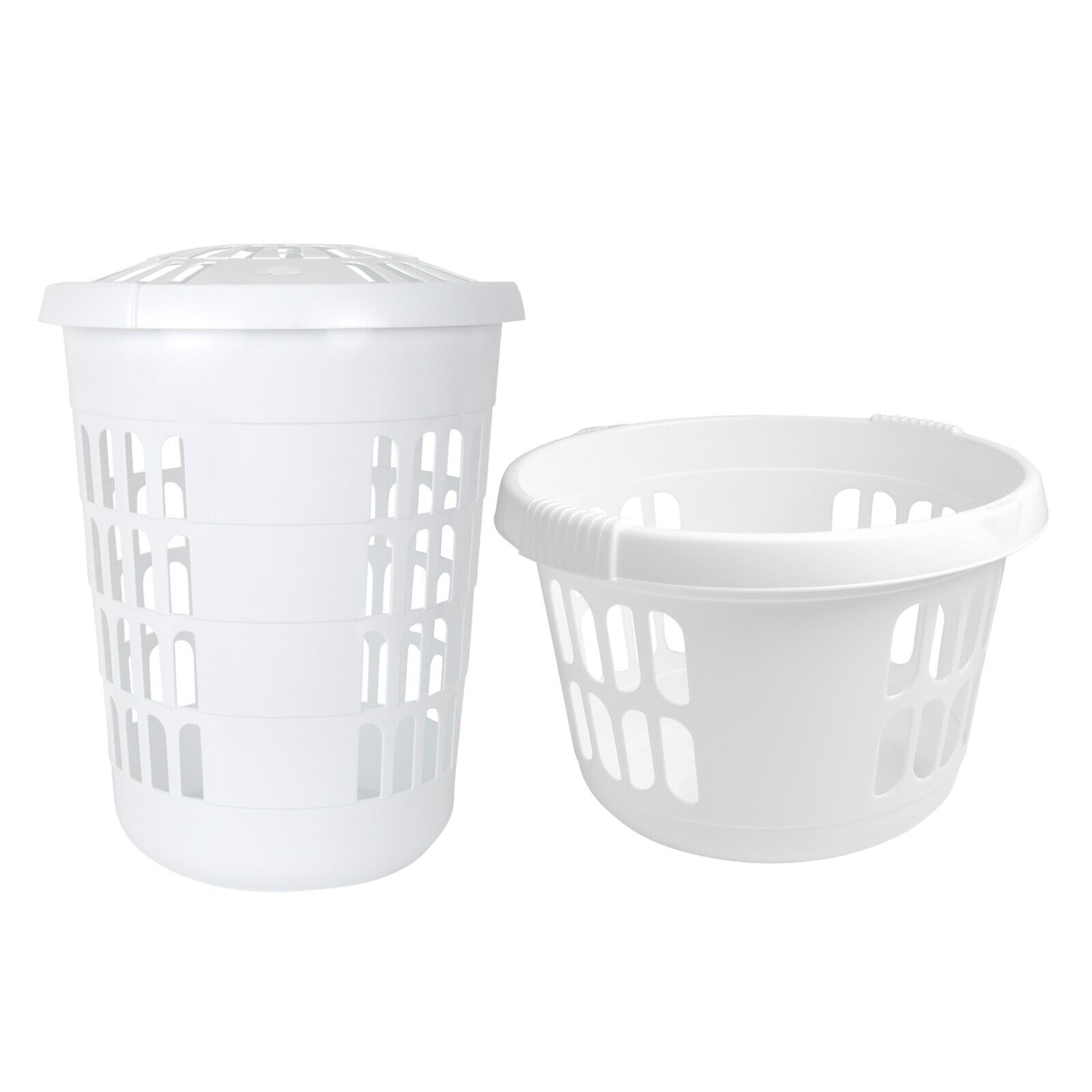 Set of Ice White- Plastic 60L Round Laundry Hamper with Lid & 50L Storage Basket