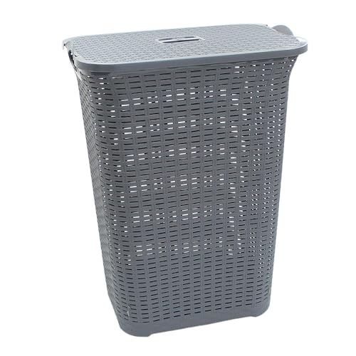 60L Laundry Basket with Lid - Large Plastic Washing Basket with Handles - Heavy-Duty Rattan Laundry Bin Hamper Clothes Storage Organiser for Bedroom & Bathroom - Grey, 60 Litre