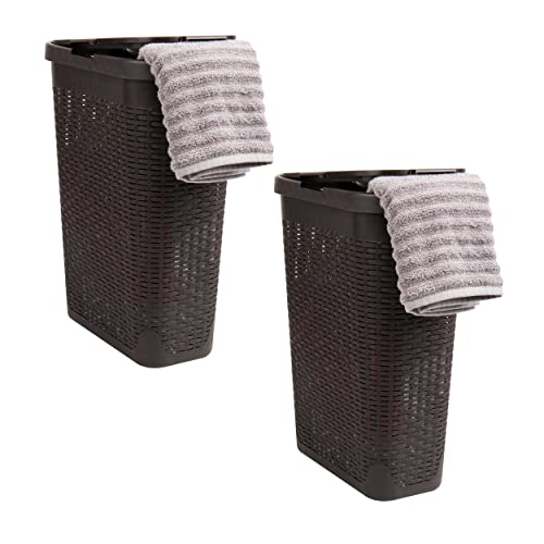 Mind Reader 40L Slim Laundry Hamper, Clothes Basket, Lid, Wicker Design, Plastic, 18"L x 10.4"W x 23.5"H, Set of 2, Brown