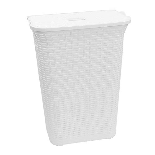 Mind Reader 50L Slim Laundry Hamper, Clothes Basket, Lid, Wicker Design, Plastic, 17.65"L x 13.75"W x 21"H, White