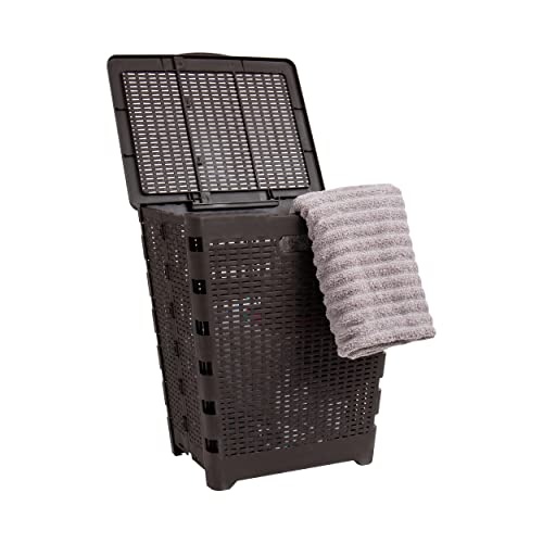 Mind Reader 61L Foldable Laundry Hamper, Clothes Basket, Lid, Wicker Design, Plastic, 18"L x 14.5"W x 21.25"H, Brown