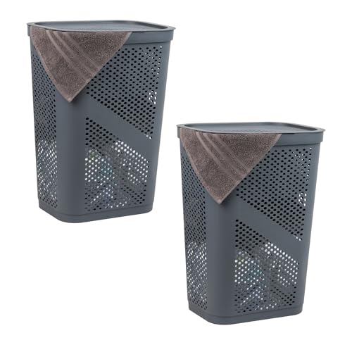 2 x Plastic Laundry Basket Washing Clothes Hamper Bin Storage With Lid 60 Ltr
