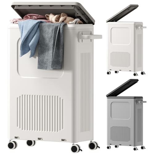 HAIXIN Plastic Laundry Basket with Lid - 50L Washing Basket with Wheels and Handle, Slim Dirty Clothes Basket 1 Pack, Large Laundry Hamper, Laundry Bin for Bathroom Bedroom Narrow Storage(Milk Grey)