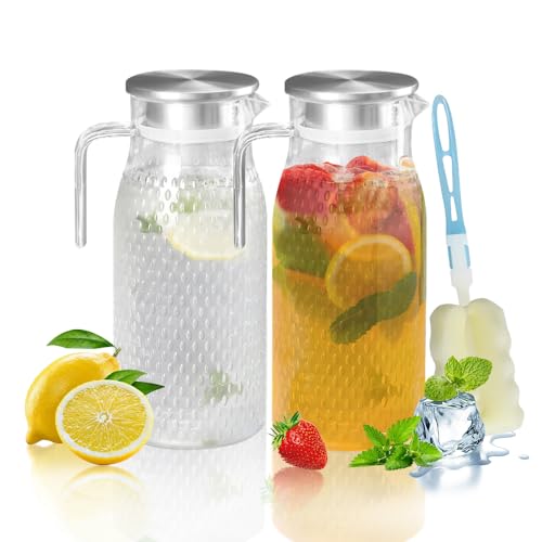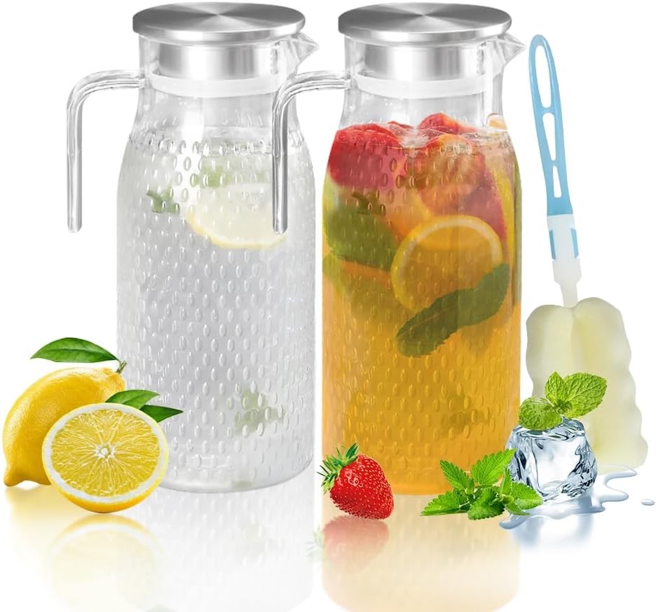 2 Pack 1.6L Plastic Jugs with Stainless Steel Lid and Handle, Acrylic Juice Jug, Transparent Fridge Water Pitcher, Unbreakable, Easy to Clearn Water Jug for Iced Tea, Lemonade, Cold or Hot (2pcs 1.6L)