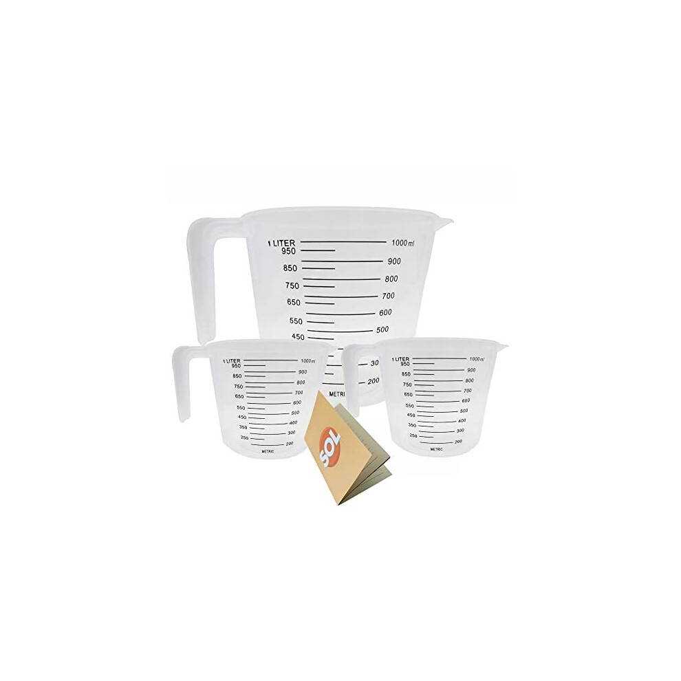 SOL 3pk Plastic Measuring Jugs 1 Litre Capacity with Clear Graduated Markings Durable Lightweight Stackable Cups for Cooking Baking Mixing Liquid Measurement Kitchen Prep and Easy Cleaning