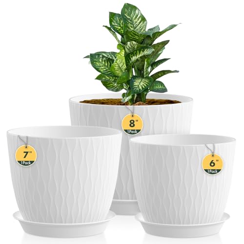 3 Pack Plastic Plant Pots,20/18/15CM,Flower Pot Large Plant Pots Indoor Outdoor Plastic Plant Pot with Drainage Holes and Tray for House Plant Flower(White)
