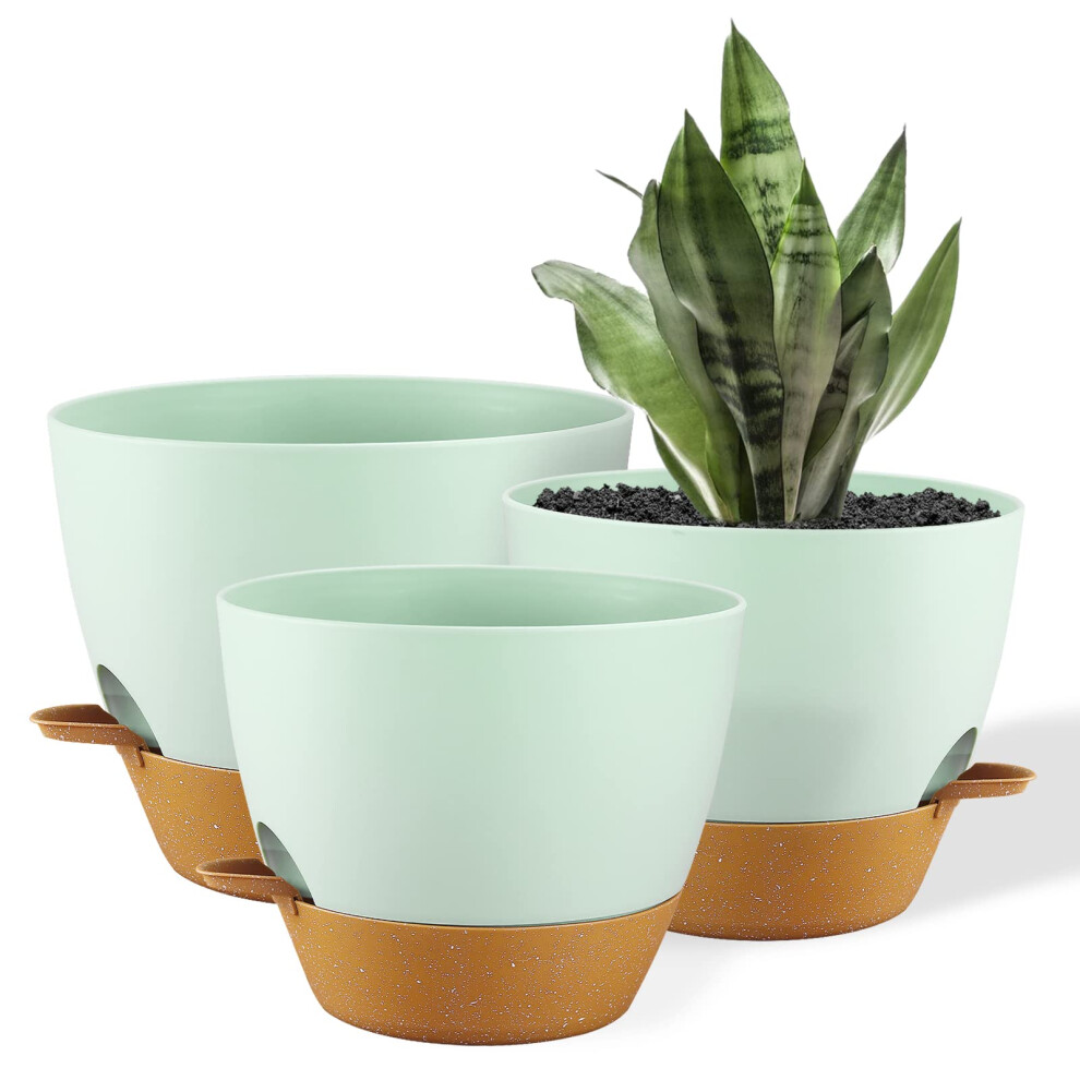 FORAGIFT 25/23/20cm Self-Watering Plant Pots Indoor, 3 Pack Large Plastic Plant Pots with Deep Reservior and High Drainage Holes for Indoor Outdoor Plants and Flowers, Green with Terracotta